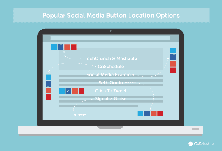 Besides this, when your website visitors share your content on their social networks, it gets introduced to an entirely new group of people, thus increasing your web visitors significantly. The image below shows some of the most common social share button locations on a web page.